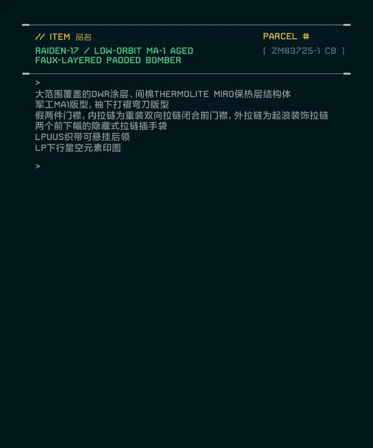 軍用MA1夾克廓形,弧形蝙蝠袖,袖窿至袖口飾有褶襉細節。