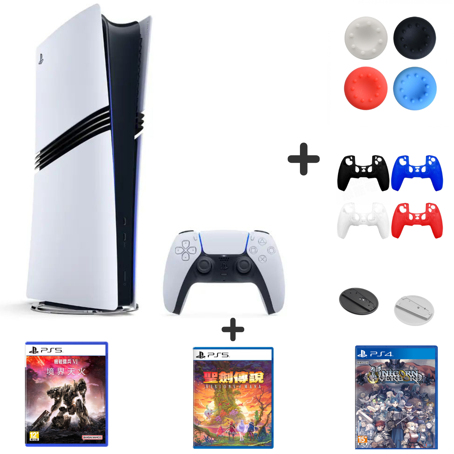 凡購買 PS5 Slim 主機 光碟版一台 + 特定遊戲一款 + 無線控制器矽膠保護套一個 + 類比搖桿保護套一組 + 主機直立架一個,超值優惠價只要 $18580!