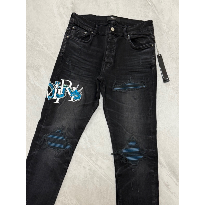 AMIRI 經典 刺繡字母搭配龍 設計 黑藍色 牛仔褲