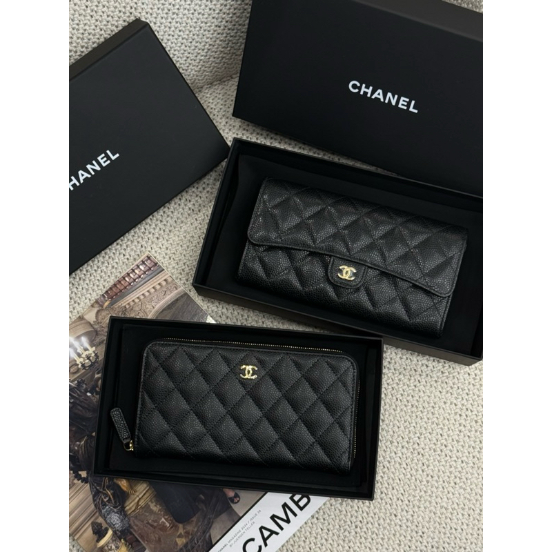 Chanel Coco 菱格紋 黑色金扣 荔枝小牛皮 拉鍊 扣式 女生 女款 皮夾 長夾
