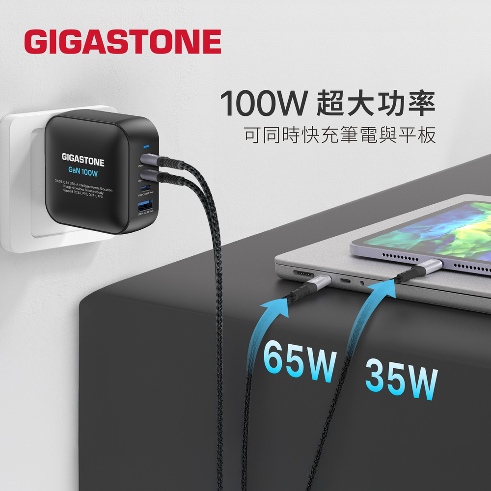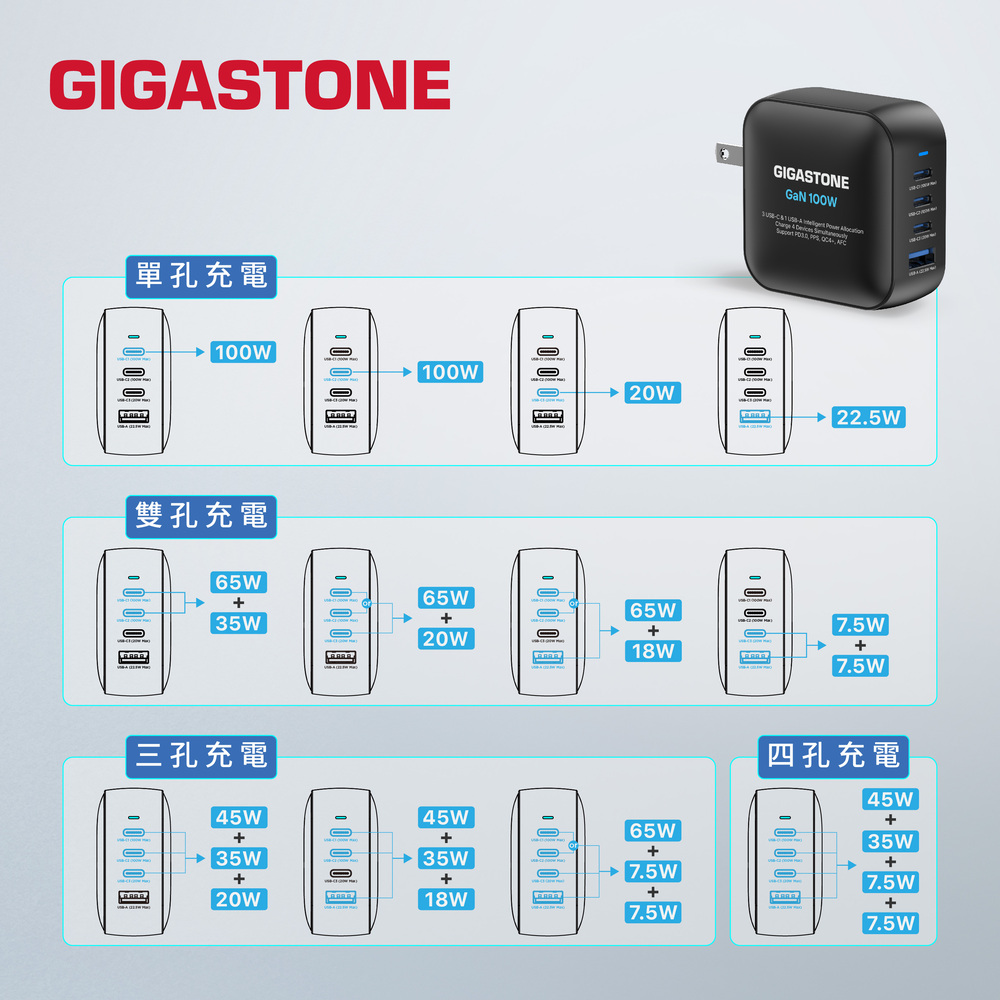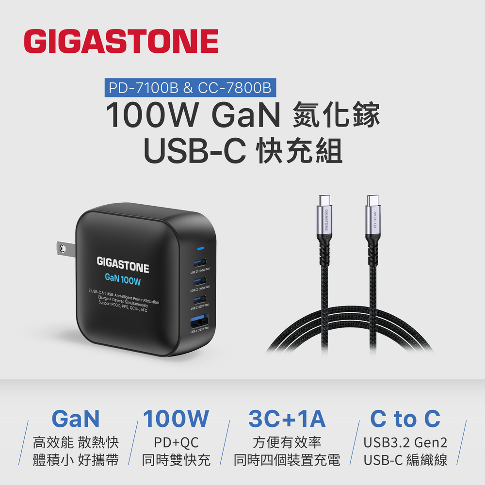 GIGASTONE PD-7100B+CC-7800B 100W氮化鎵GaN四孔急速充電器組