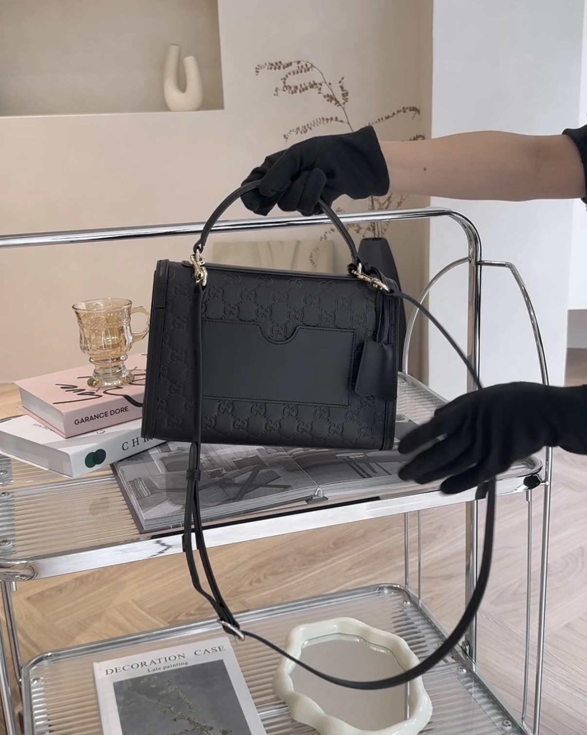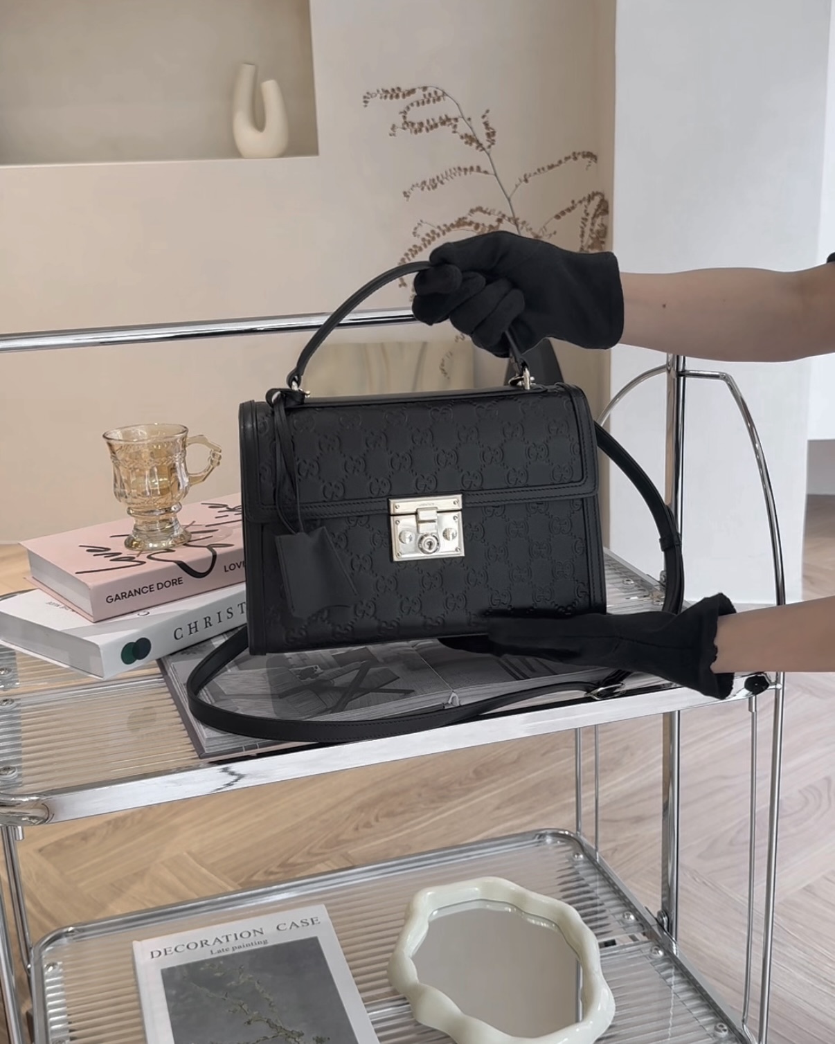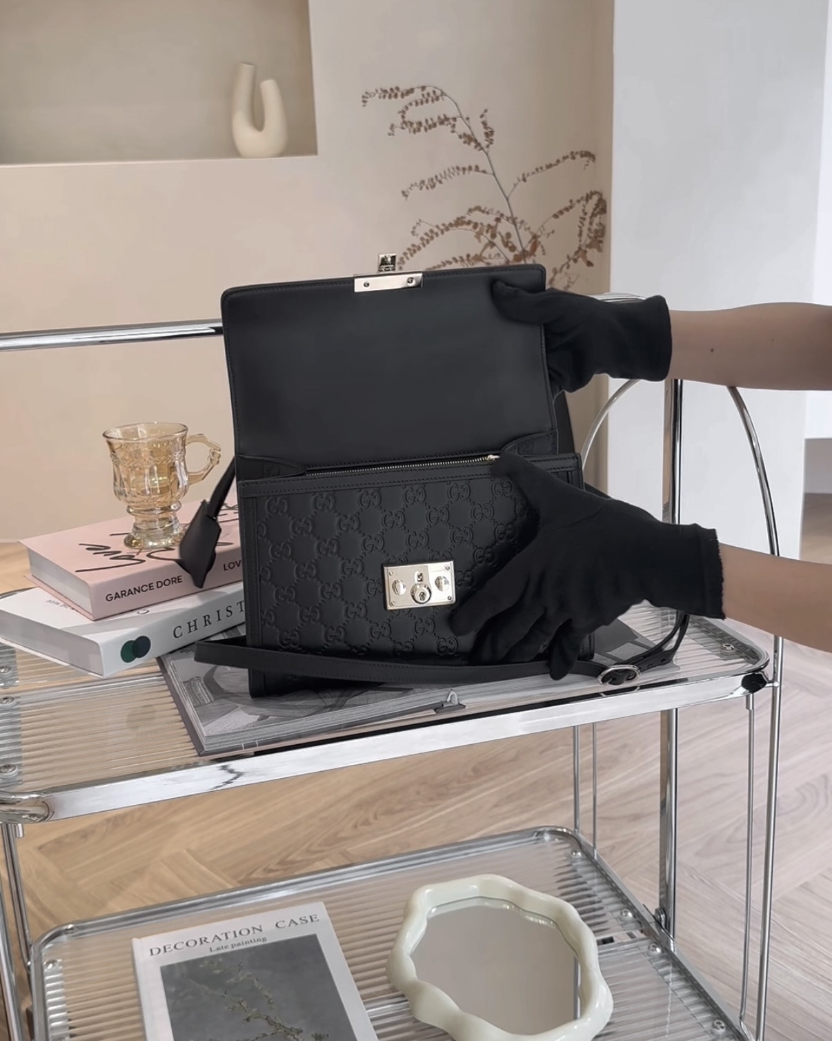 【GUCCI】PADLOCK 手提單肩包 中號 黑色壓紋老花