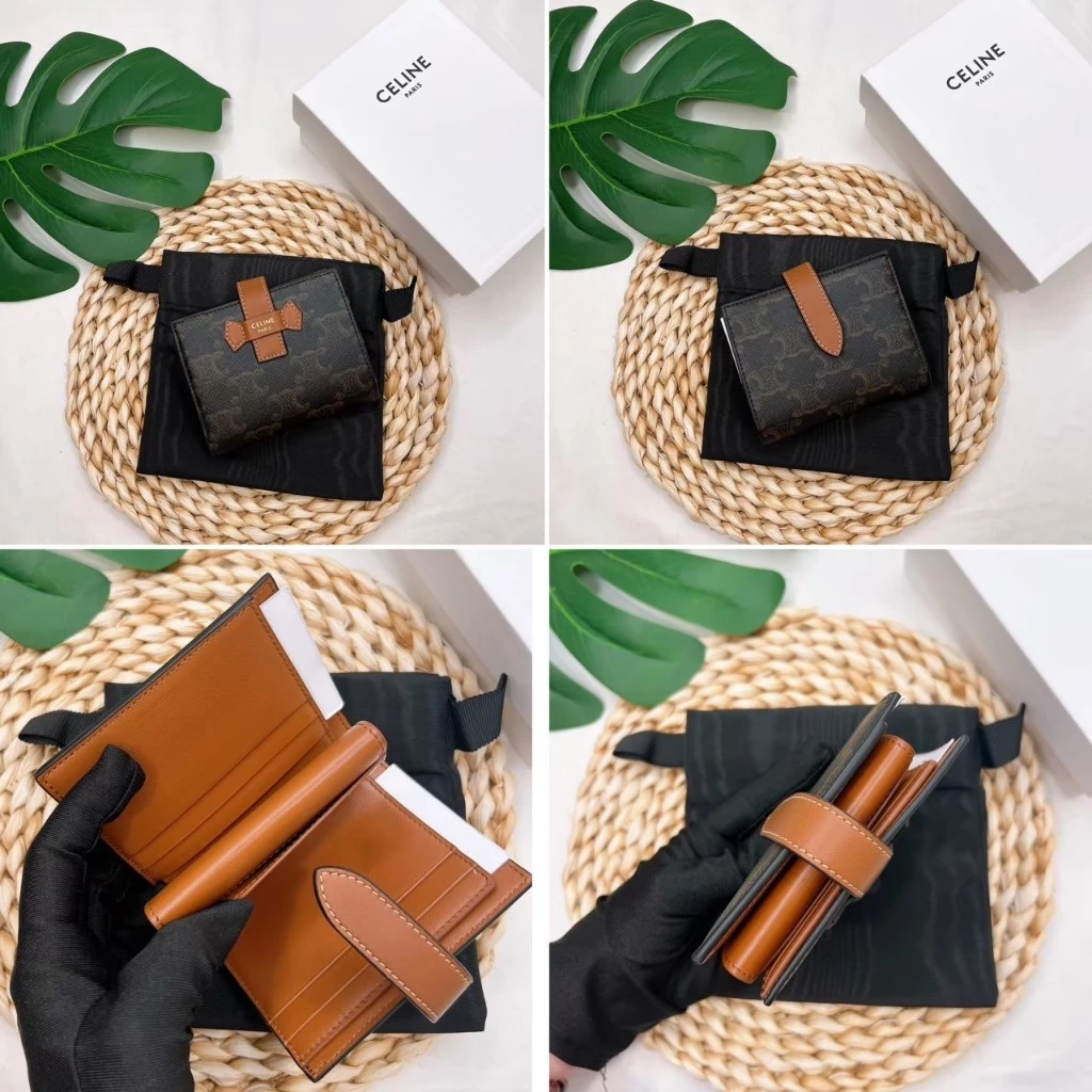 Celine 經典TRIOMPHE滿版老花帆布拼接小羊皮壓釦短夾