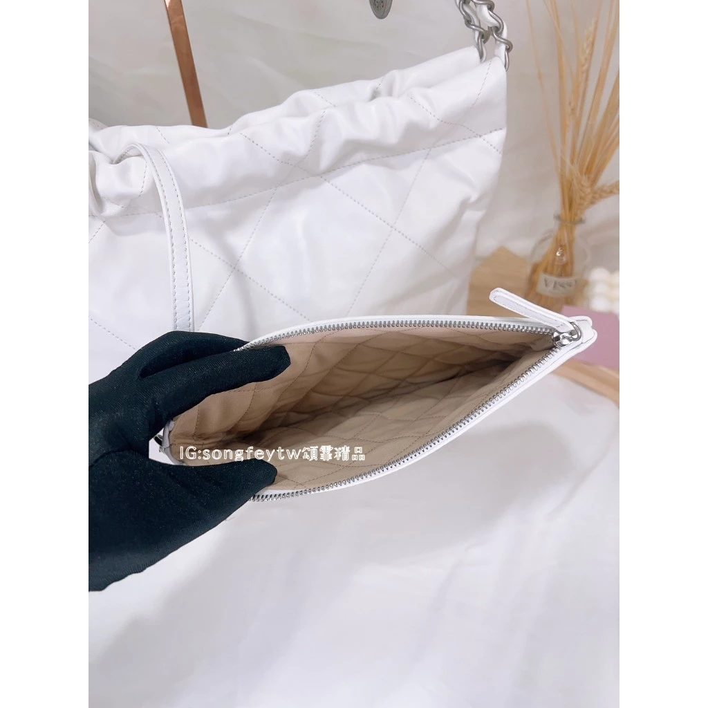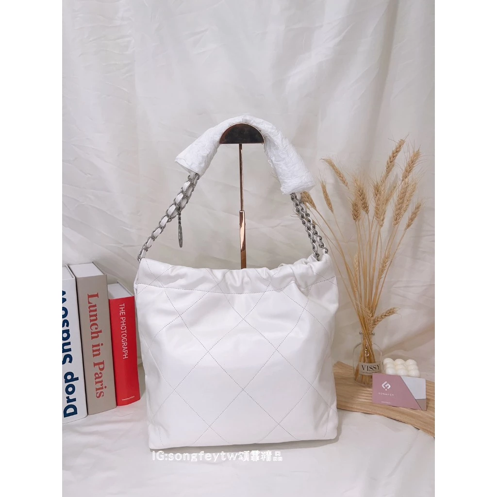 CHANEL 22 小牛皮銀鍊白色 肩背包/垃圾包 (ˇ中款/晶片款)