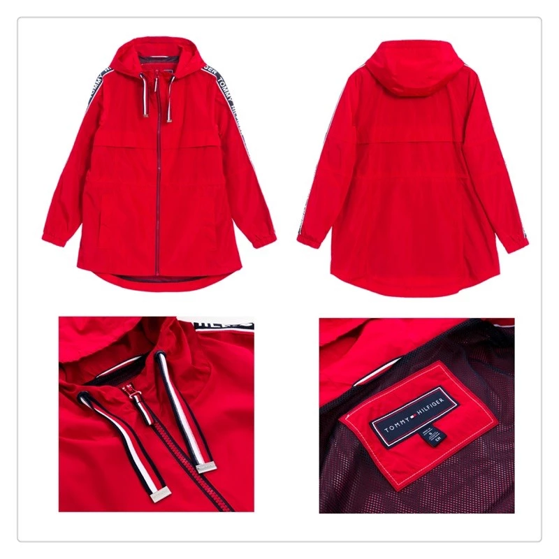 【Tommy Hilfiger】女 春夏薄款 連帽長版修身風衣/防曬防潑水外套/衝鋒外套