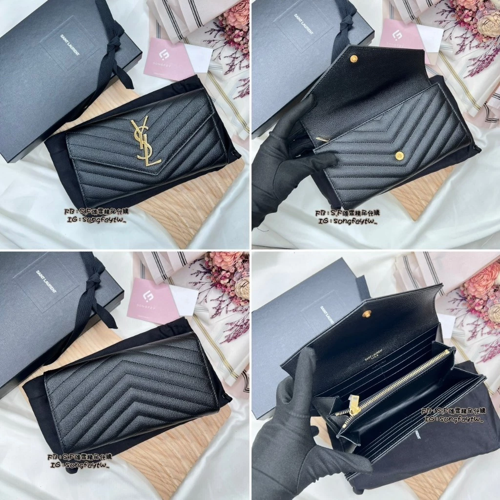 YSL MONOGRAM系列V字縫線魚子醬牛皮金屬LOGO信封長夾(黑+金)