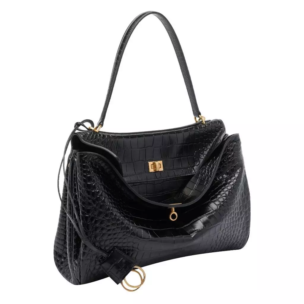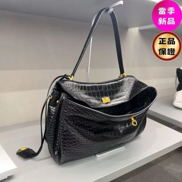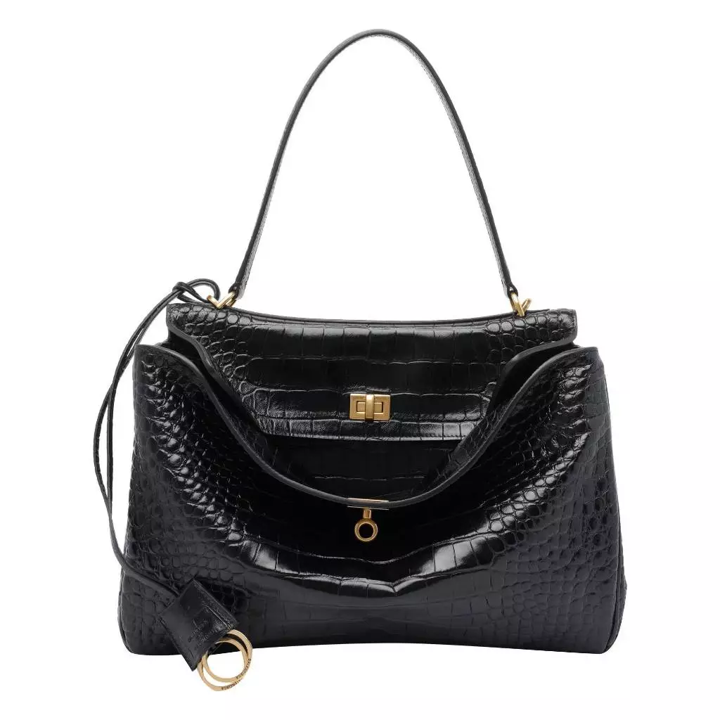 產品概述Balenciaga Rodeo 中型手提包,以鱷魚壓紋小牛皮打造立體包身,結合結構感輪廓與洗鍊線條,詮釋品牌標誌性的現代奢華風格。時尚特色經典黑色搭配仿舊金色金屬件,低調中流露高級氣場,適合都會日常與正式場合。