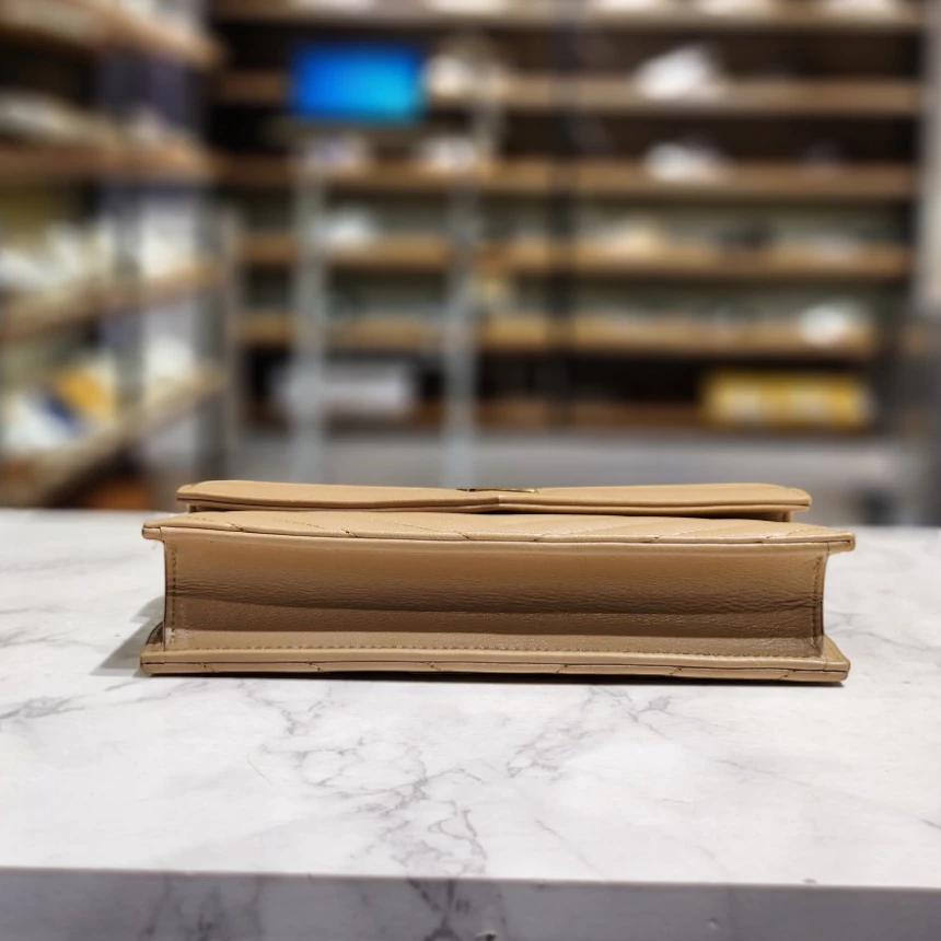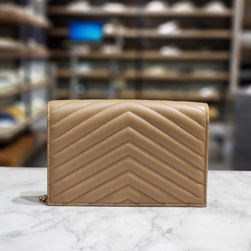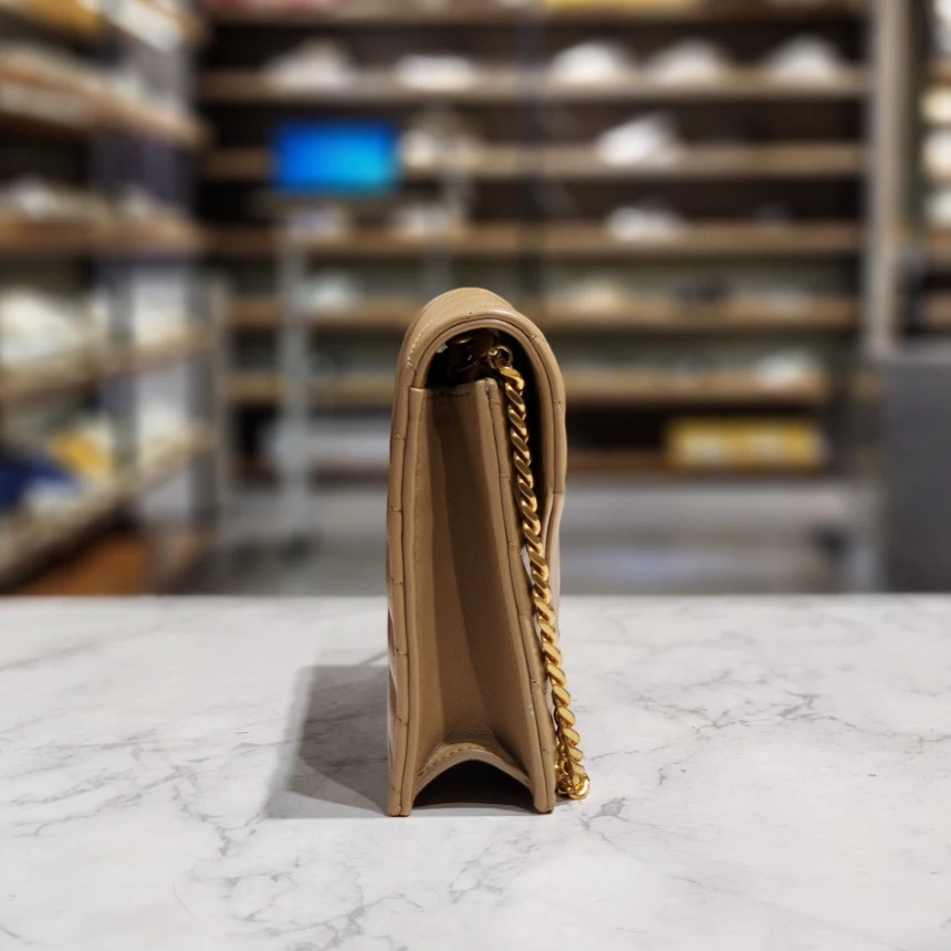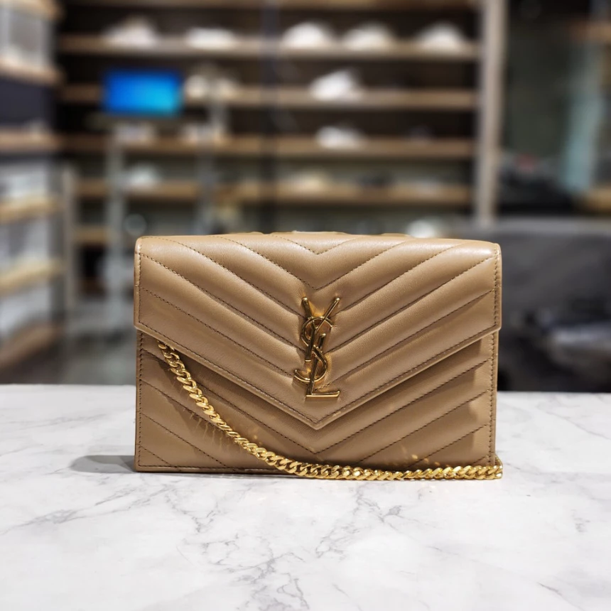Saint Laurent YSL 742920 小款羊皮 woc 皮夾鏈帶包 奶茶棕 金鍊
