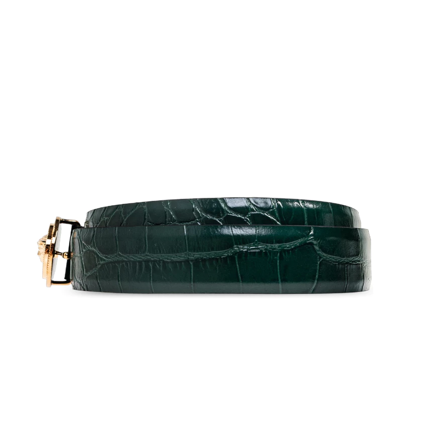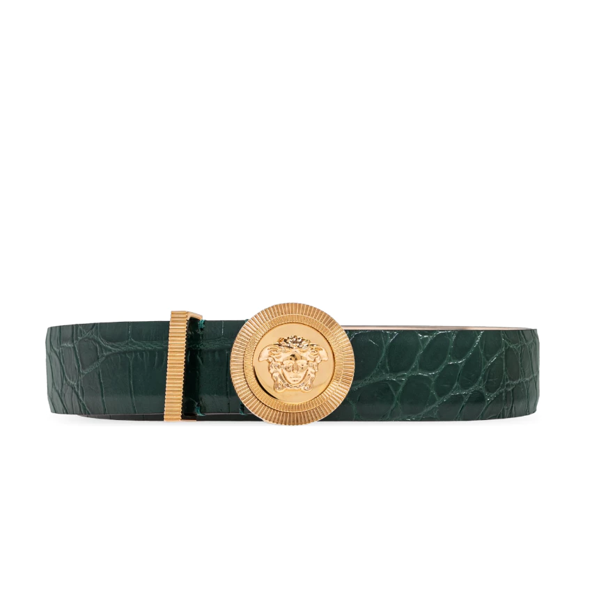Versace Medusa Biggie 3公分寬中性款鱷魚壓紋皮革腰帶 80/85公分 綠色/金釦